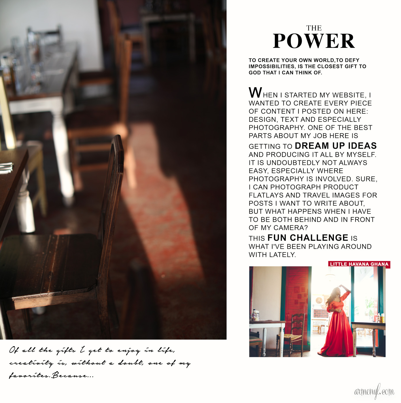 My latest editorial fairytale takes place in the warm streets of Cuba. Well not exactly, but that’s where I was transported to when I visited the Afro-Latino restaurant in Accra aptly named Little Havana. It was a charming, vintage-looking, Havana inspired restaurant with lots of character in its decor. Special thanks to my amazing friends and family for your tremendous support in bringing my crazy imaginations to life.