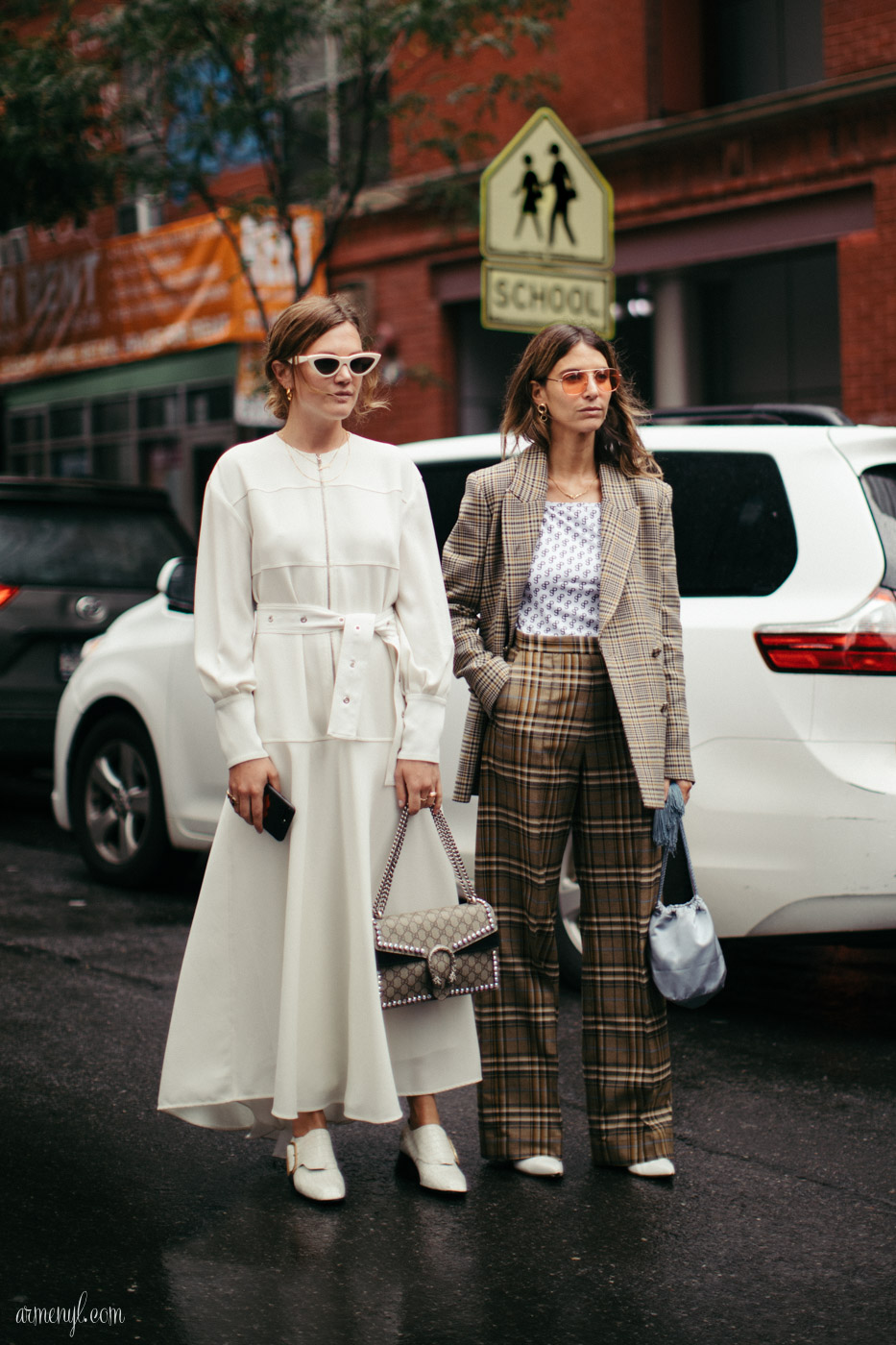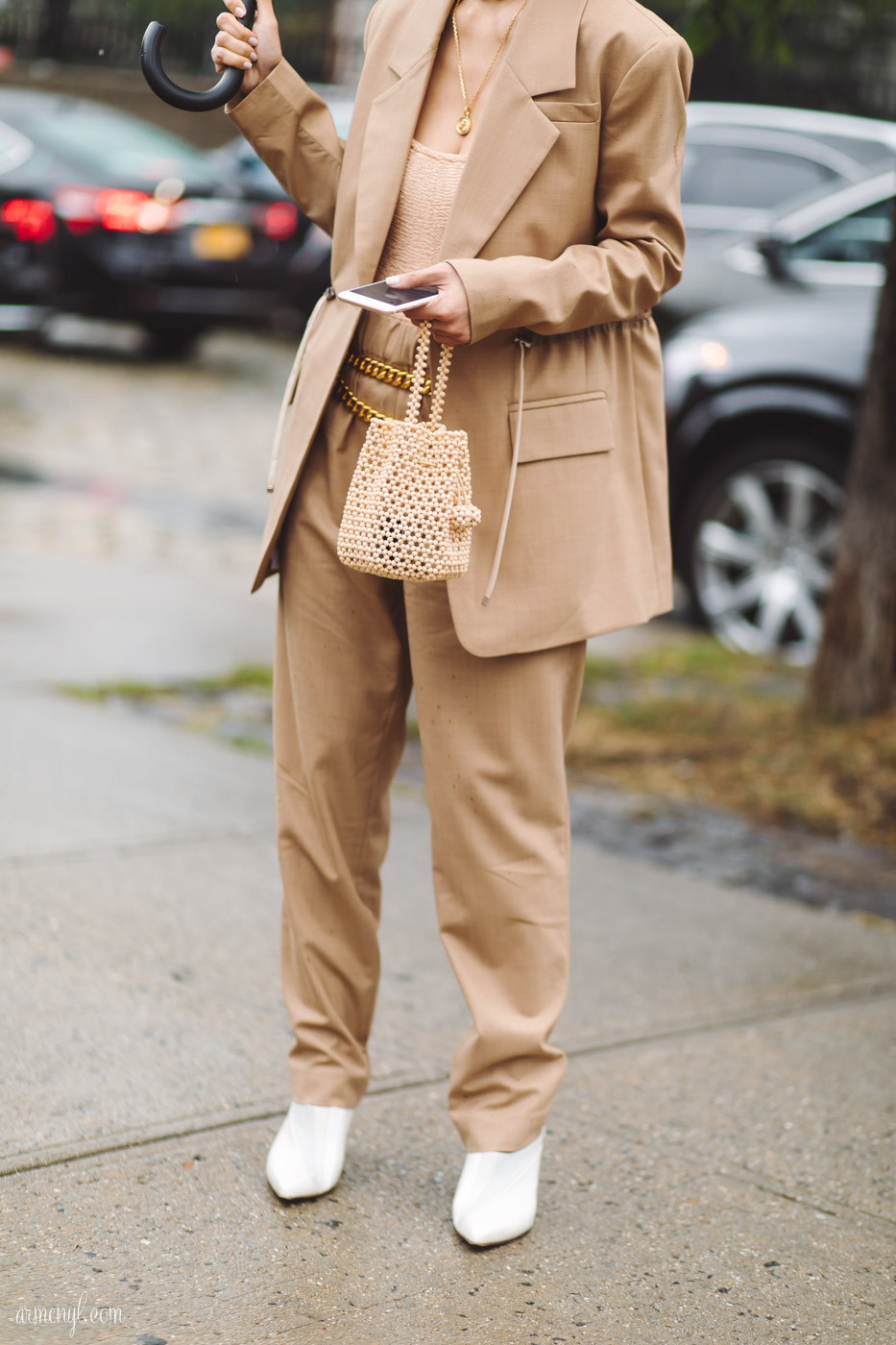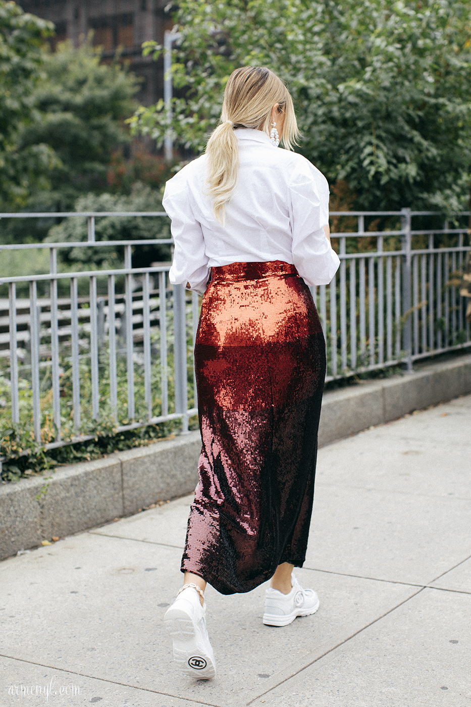 White shoes have always been attention grabbing, and it can take some finessing to not overwhelm a look. Personally, I have always found the style piece limiting—until now! The streets were bursting with surprising and creative ways to rock the white shoe. I myself had a few white shoe moments at fashion week, and I remember feeling particularly nervous about pairing my white sneakers with my blue button down skirt and leopard print belt, but when I marched them down the streets of fashion week, it certainly didn’t take tapping my heels three times to make me feel at home.*